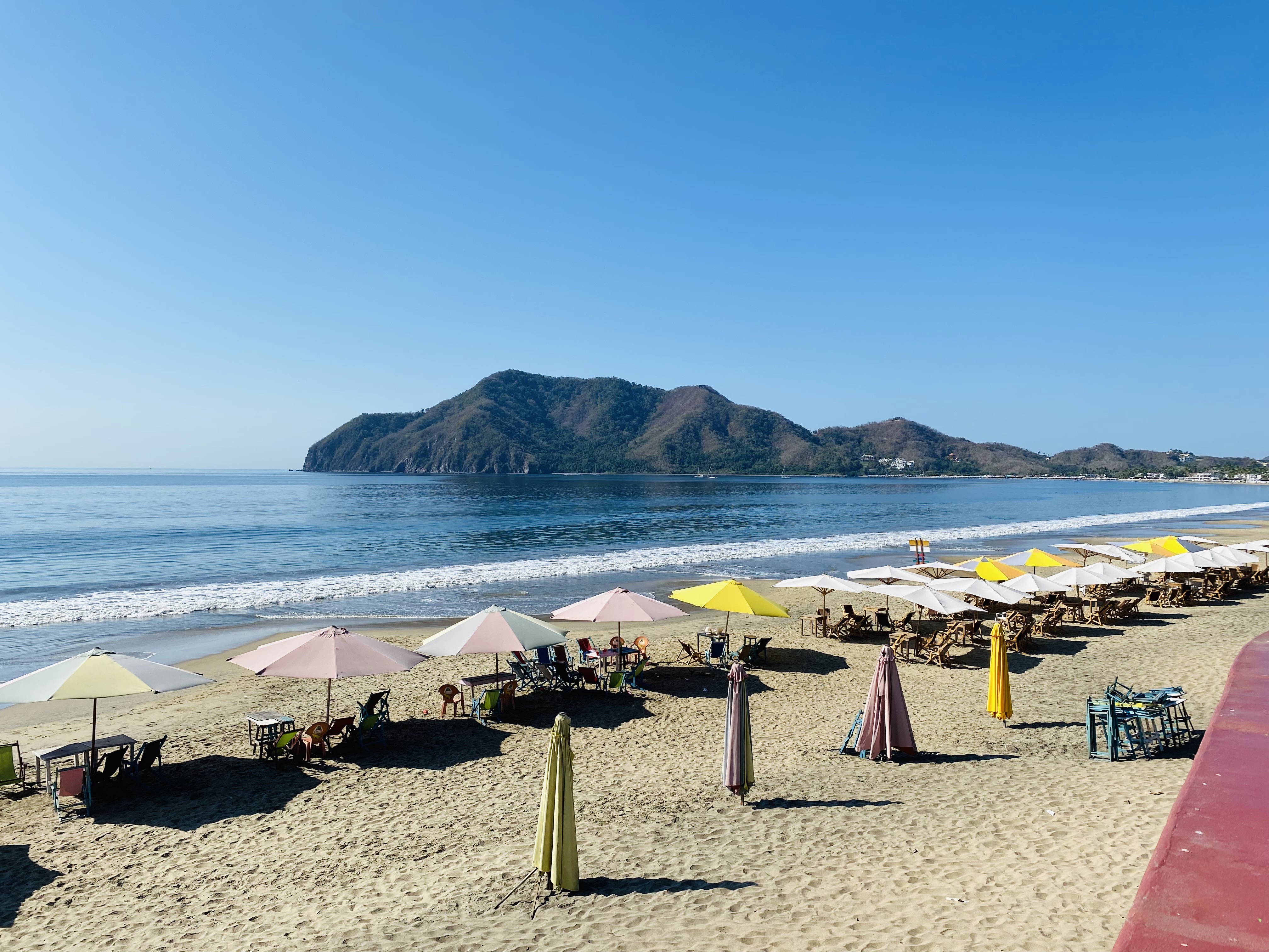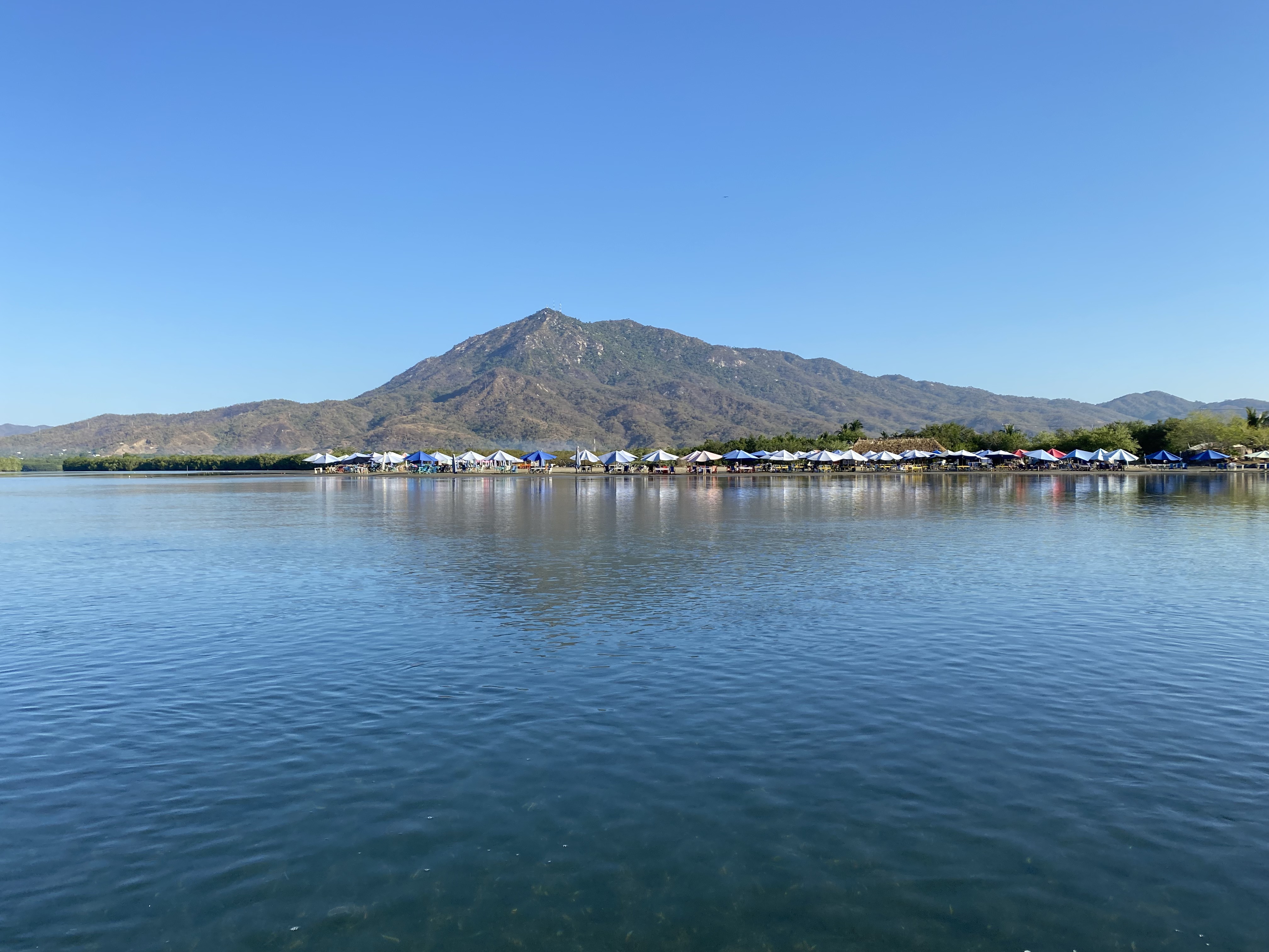 Carrizal is a unique stop as it is untouched from development and has a live coral reef for snorkeling. The anchorage is small and had too many boats when we passed so we did not stop. We moved further into the bay and set anchor in Santiago Bay. Jim jumped in for a swim and was stung by a jelly fish around his stomach and sides. We picked the tentacles off his swim trunks and sprayed his belly with white vinegar to relieve the sting. The lengthy beach inside the bay is full of palapa restaurants on the north end, a community of high end homes in the center and more palapa restaurants to the south. We walked Club Santiago, the community behind the beach, and the highway through town. We took a dingy ride to explore the lagoon area behind the bay and had a delicious lunch with Brian and Joanna at Oasis restaurant; which offers a variety of Asian-Mexican fusion dishes and a nice change to shake up our on-shore meals. Earlier that day while Brian was in the water cleaning the hull of their boat a tiny crab swam into his ear! Brian tells the story much better, maybe you can imagine the fluttering sound effects, and luckily he was able to drive the crab out without issue using a qtip, some alcohol and a few shakes of his head [edit: the crab was released back into the ocean, unharmed].