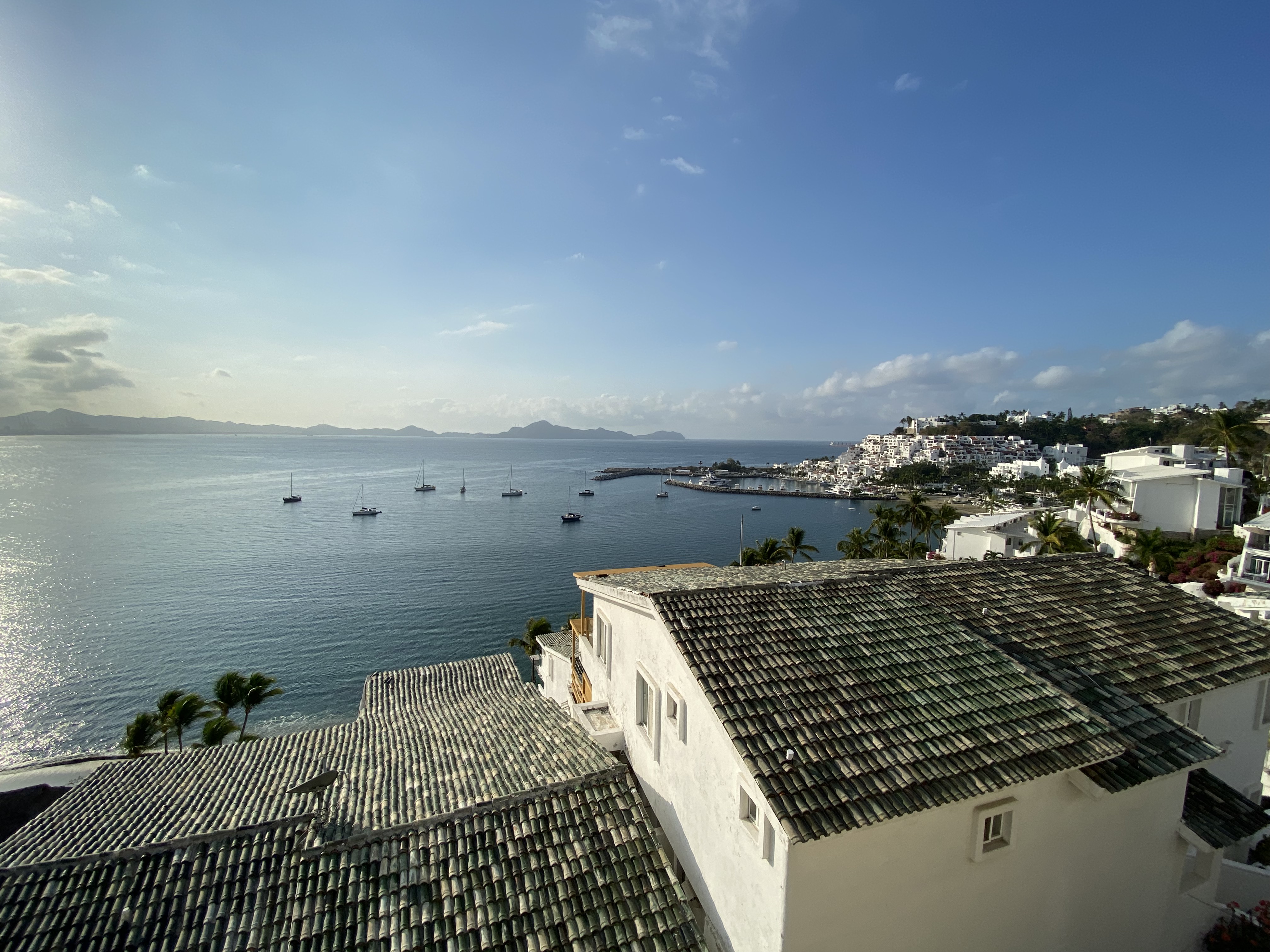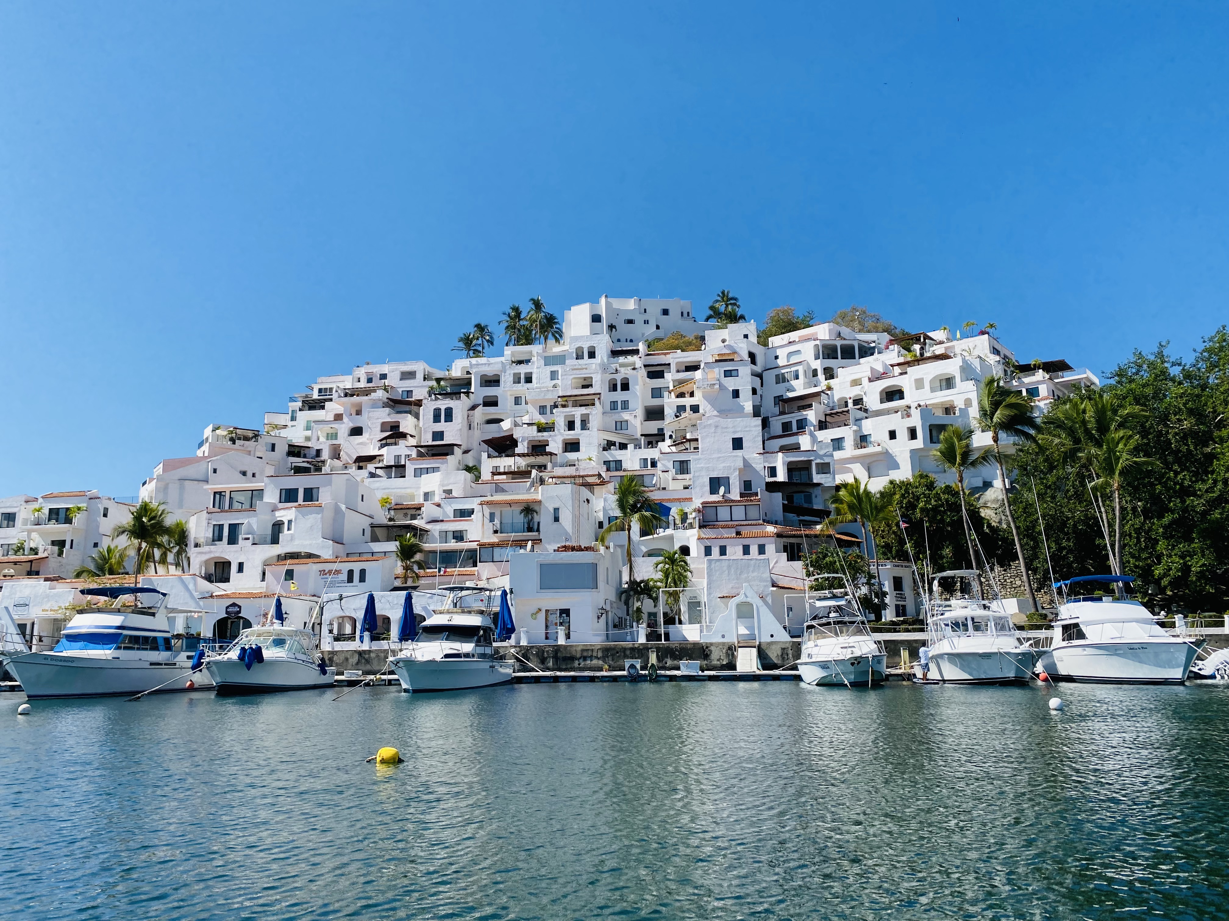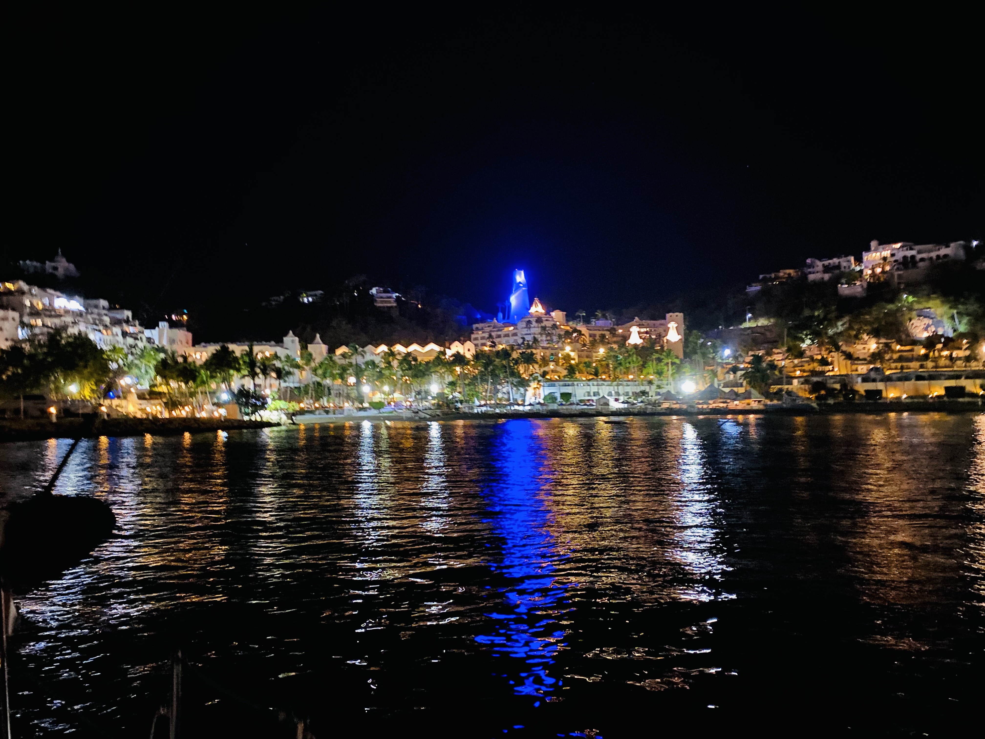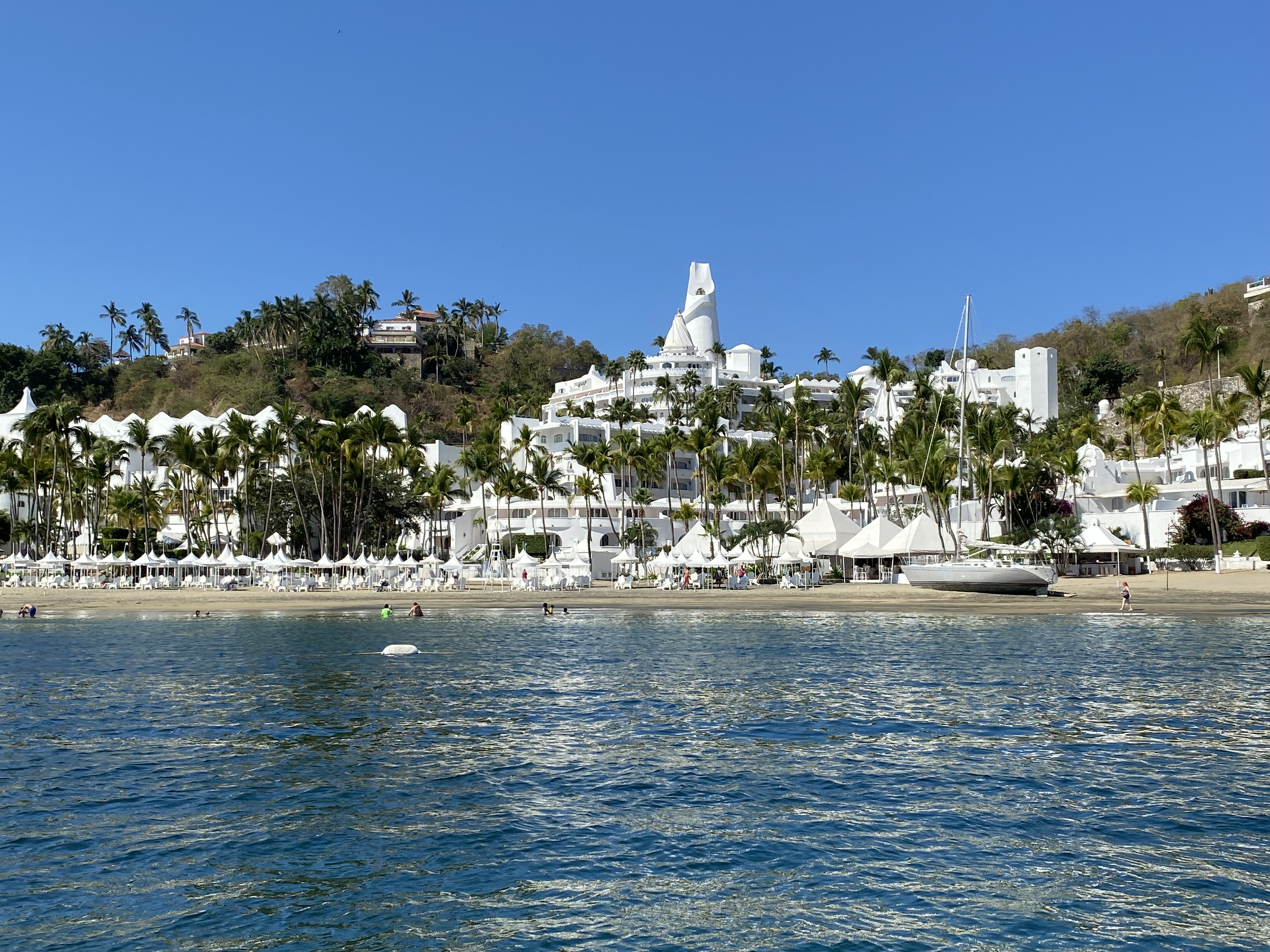 After two days in Santiago we moved over to Manzanillo Bay and anchored off Las Hadas. What a place! The hillside hotel, Las Hadas by Brisa, and the condominiums around the point looked like we had been transported to the Mediterranean. There is an interesting article from 1984 about the history of the Las Hadas property in the New York Times here…https://www.nytimes.com/1984/12/09/travel/mexicos-rivierastyle-resort.html.