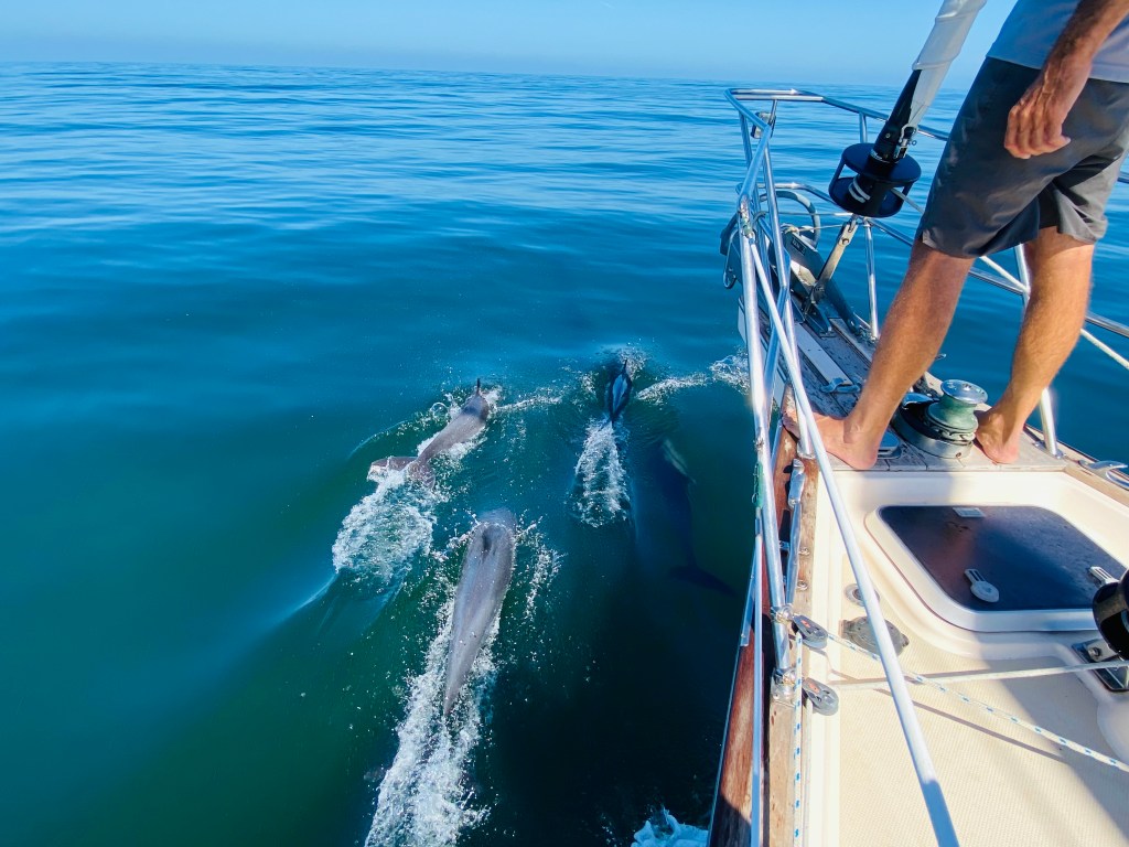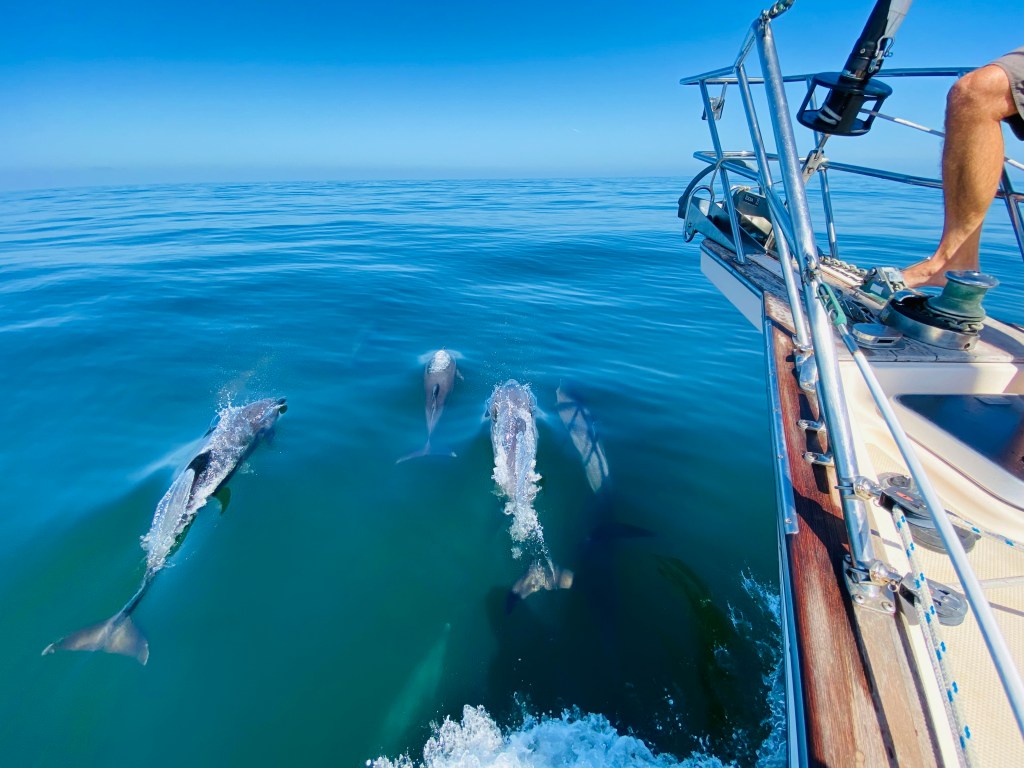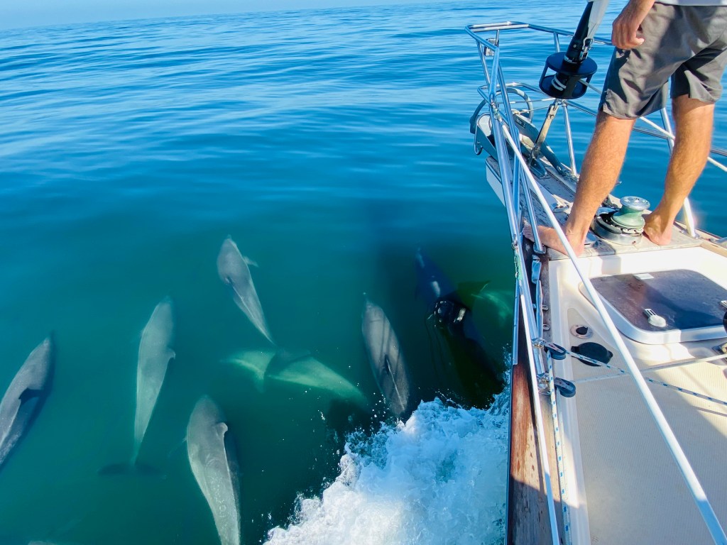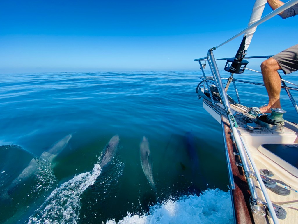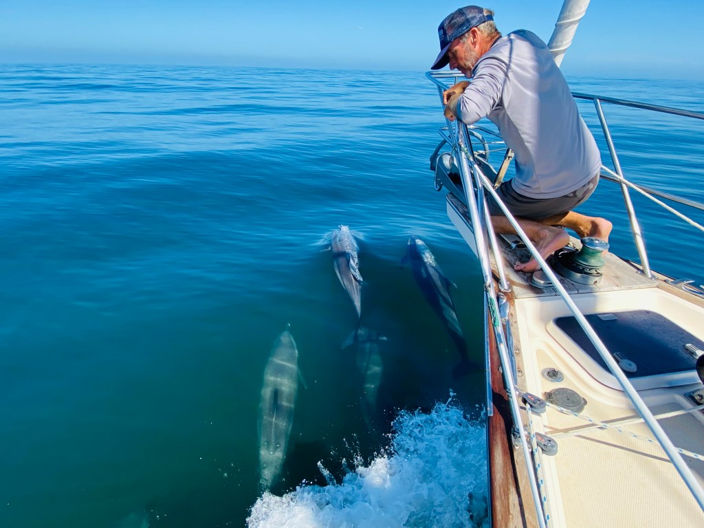 A few miles off San Blas we saw a large group of dolphins circling, they appeared to be feeding. As we passed by, part of the group broke away and started swimming over to us. Soon after, a steady stream of playful dolphins bounded towards Solitude leaping out of the water creating a trail about a quarter to a half mile long. There had to be hundreds of dolphins. They swam along side Solitude and followed behind us for 30 minutes before they disappeared. It was incredible. We have video that we are not able to post here but have included a few photos of dolphins swimming near the bow as well as stills we were able to capture from the video.