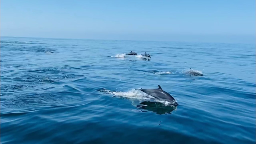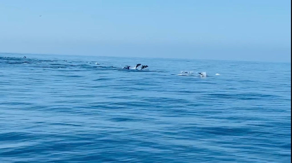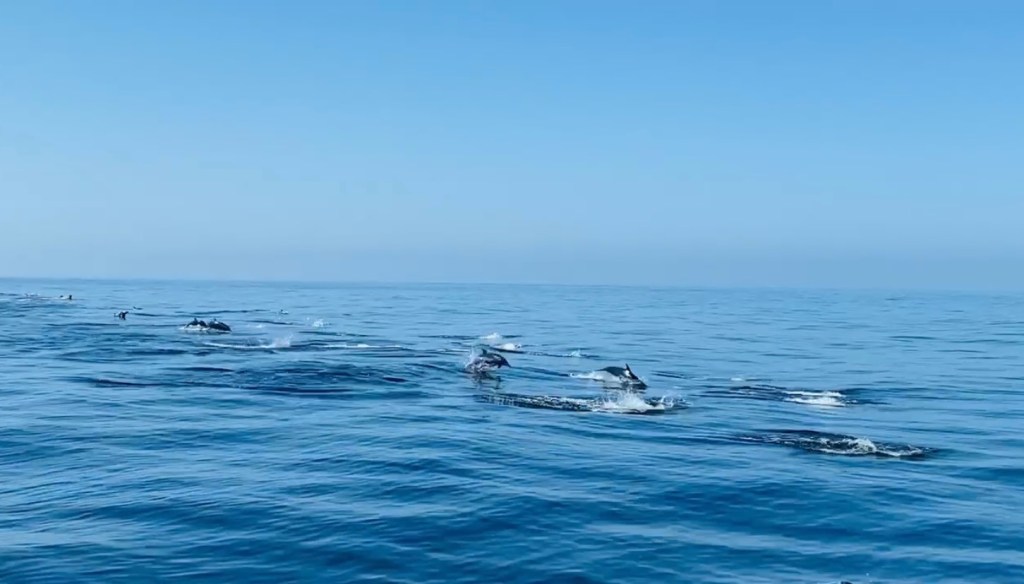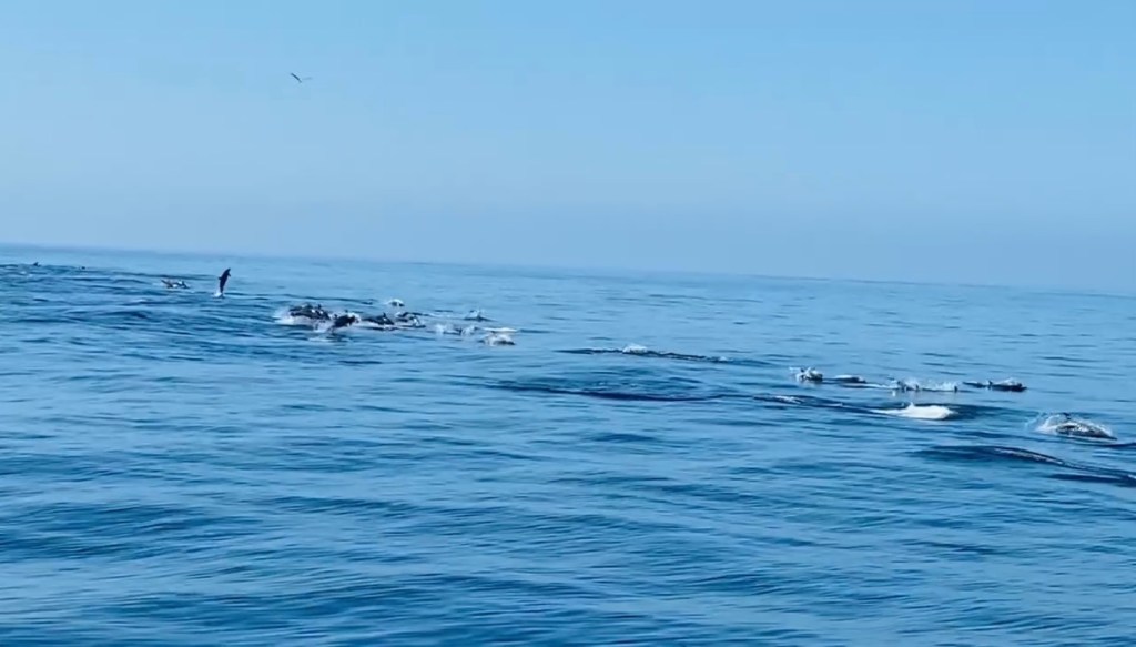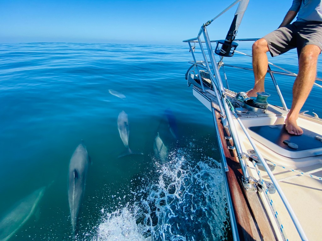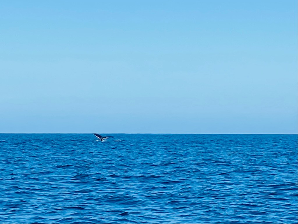 A few miles off San Blas we saw a large group of dolphins circling, they appeared to be feeding. As we passed by, part of the group broke away and started swimming over to us. Soon after, a steady stream of playful dolphins bounded towards Solitude leaping out of the water creating a trail about a quarter to a half mile long. There had to be hundreds of dolphins. They swam along side Solitude and followed behind us for 30 minutes before they disappeared. It was incredible. We have video that we are not able to post here but have included a few photos of dolphins swimming near the bow as well as stills we were able to capture from the video.