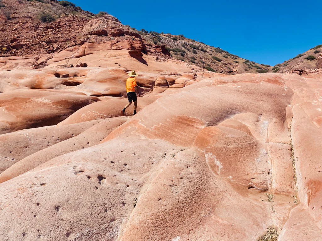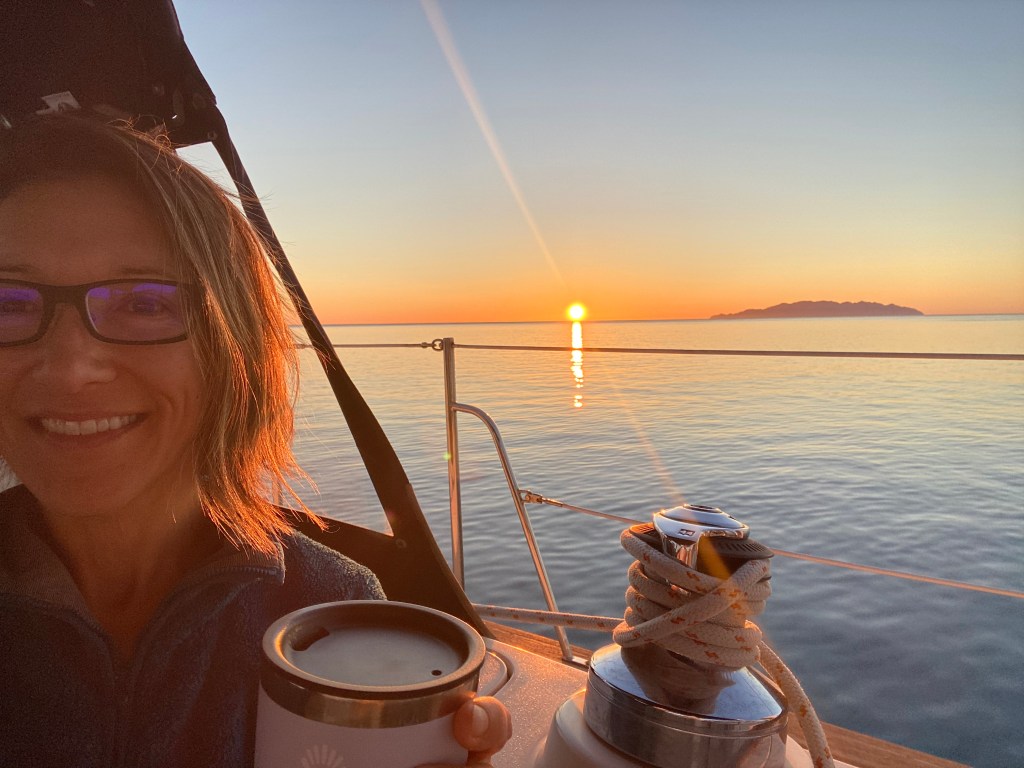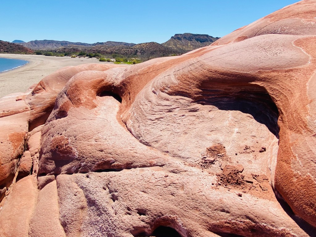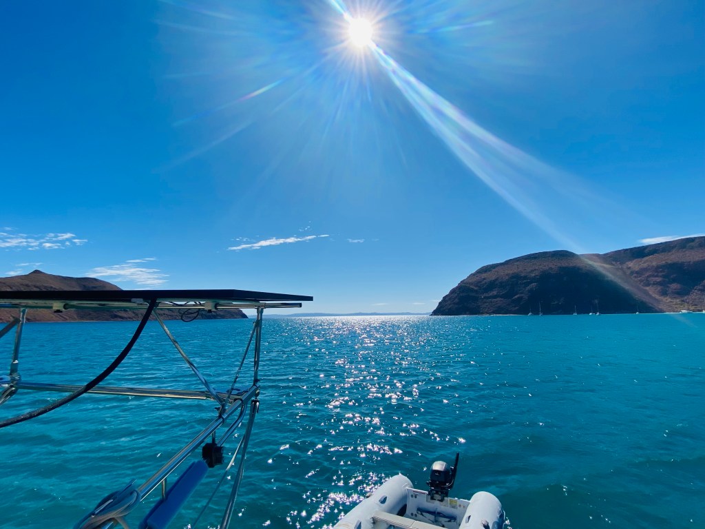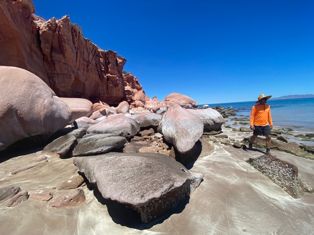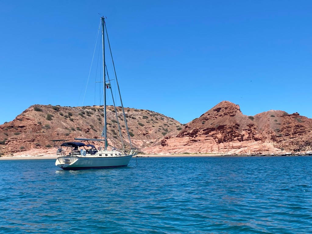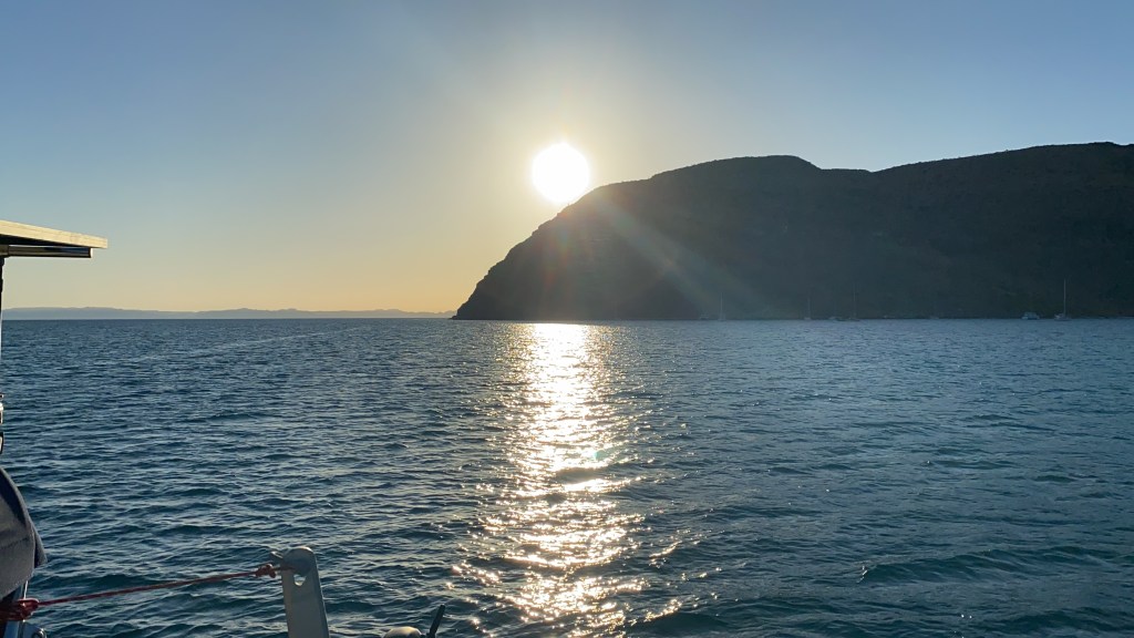 We left San Evaristo for Los Gatos the next morning, excited to be progressing further north into the sea. Another day of calm conditions. We arrived at Los Gatos early in the day and were the only boat in the anchorage. This is a remote anchorage with no structures or services – only beach, cactus, rock, and lots of bees. We had some recyclables in the cockpit and water in the galley sink, which they quickly found and we quickly learned both were an unfortunate oversight. Luckily all the screens were on the hatches and portlights so we just needed to put up the bug net over the companionway; then we swatted and cleaned and ran and hid until they gave up and left. We hiked around the rocks on shore and swam from the boat. By sunset, seven more boats came in including an Island Packet 379, of which we were told only one was made. Other than a change to the swim step, it looks identical to our boat (an IP370). We spoke with the couple onboard as well as a few other cruisers in the anchorage. We watched another fabulous sunset before dinner and, after a restful night, were back in the cockpit with coffee for sunrise the next morning.